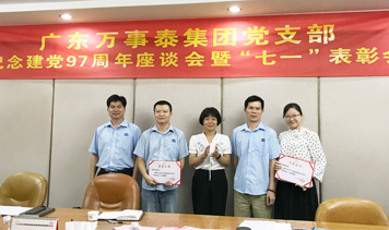 集團訊 為慶祝中國共產黨成立97周年,回顧黨的光輝歷程,繼承和發揚黨的優良傳統,增強萬事泰黨員們的凝聚力和工作積極性,充分發揮共產黨員的先鋒模范作用 ,6月29日下午,廣東萬事泰集團黨支部召開紀念建黨97周年座談會暨“七一”表彰會。系統黨委副書記陳婉華參加會議,并為先進基層黨組織和個人頒獎。