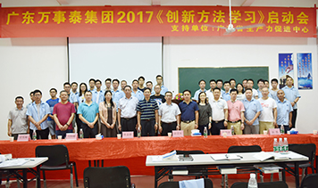 集團訊 為提升企業一線科技人員創新思維和創新能力,促進企業技術創新和科技成果轉化,進一步擴大創新方法推廣應用范圍,以及提高企業整體研發速度,在廣東省生產力促進中心鼎力支持下,萬事泰集團開設了2017創新方法學習培訓課堂。7月15日,廣東萬事泰集團2017創新方法學習啟動會在萬事泰總部食堂三樓培訓室舉行。省生產力促進中心主任陳金德、院長梁雪梅、縣不銹鋼商會副會長兼秘書長彭藝年、研究院老師陳國榮、閩雁…