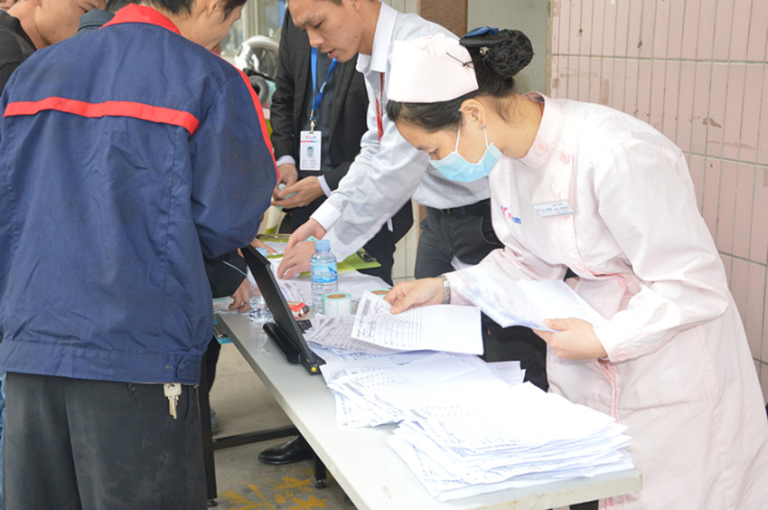 (萬(wàn)事泰員工正在排隊(duì)進(jìn)行胸透體檢)