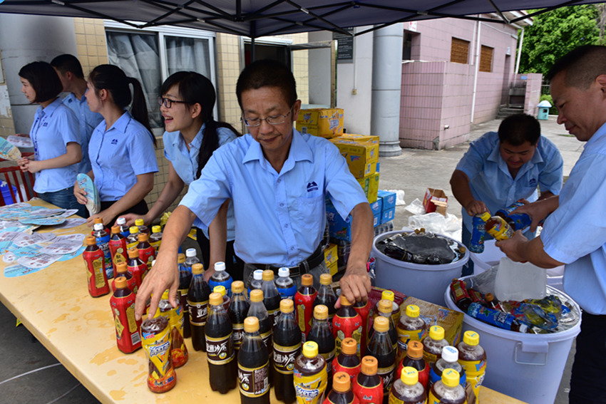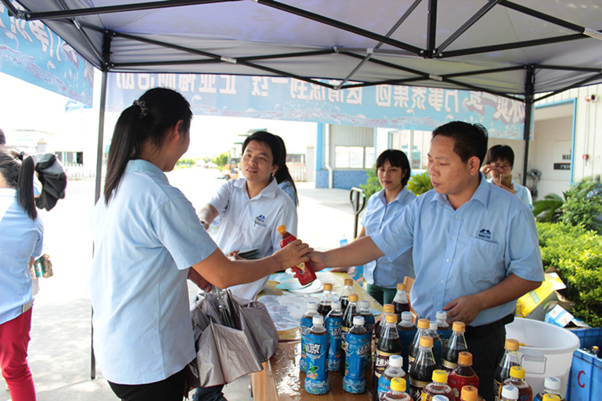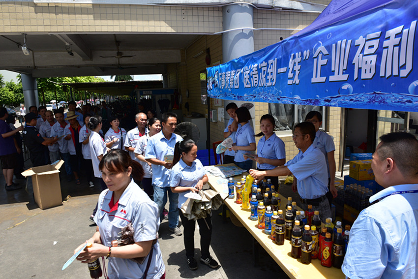 當天下午1時許,集團總部中門、事業二部門口,兩個藍色的帳篷,“萬事泰集團送清涼到一線企業福利活動”橫幅醒目顯眼,在高溫天氣里營造了涼爽的氛圍。近5000支不同品類的瓶裝飲料已在冰塊水桶里冰鎮起來,集團訂制的便攜小扇子也整齊擺放,靜候上班的員工到來。總裁辦主任梁賢武、行政部副經理陳煥文、工會主席梁洪光等集團管理層親自上陣,為辛苦勤奮的一線員工親自送上一瓶冰鎮飲料,道一聲“您辛苦了,清涼一下!”上班時間一到,一線員工們排成整齊的隊伍領取集團發放的冰鎮飲料,拿著印有集團品牌和解暑小常識的扇子,開心走向各自的崗位。
