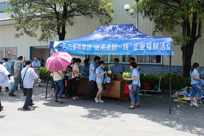 集團訊 2016年7月22日,大暑,氣溫達到36攝氏度。萬事泰集團“送清涼到一線”企業文化福利活動在集團總部、分公司相繼展開,多種冰鎮冷飲,在酷熱的午后時分,為如期上班的一線員工送上一份清涼。據悉,高溫天氣為集團員工免費派發解暑飲品,是萬事泰的傳統員工福利,彰顯集團在盛夏時節對員工的身體健康細心關懷。