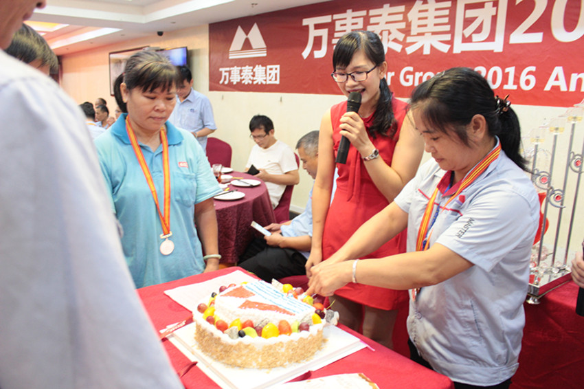 晚宴開始前,最特殊溫情的環節出現了!集團為8月生日的新晉榮譽員工慶賀生日,四位當月過生日的老員工十分驚喜,在現場感動得眼眶濕潤。一位員工表示,這是她度過最特別最難忘的一個生日,在萬事泰工作了十多年,心里很溫暖,家的溫暖,親人的溫暖,是支持她在這里扎根的重要原因。