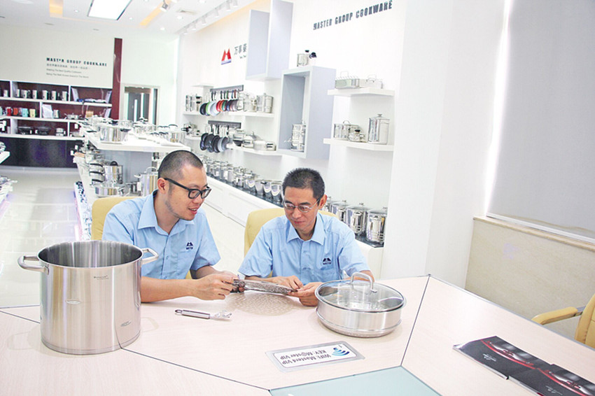 技術(shù)人員正對(duì)鍋具進(jìn)行研究討論。