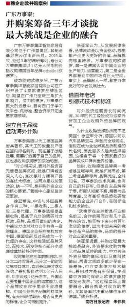 他說,收購德國品牌第一考慮是區(qū)域?qū)颍褪菙U展市場,第二考慮品牌導向,品牌沉淀,全球知名。萬事泰的技術完善,也有自己的科研所,但是自主品牌等于零,市面認知度不高,需要與品牌度高,又有高標準品質(zhì)和研發(fā)能力的企業(yè)進行合作,實現(xiàn)標準和技術輸出。