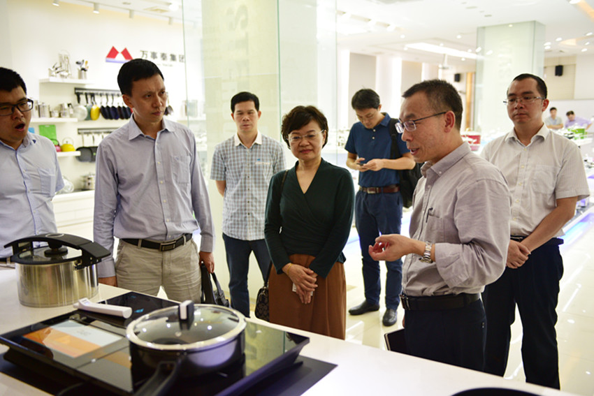 隨后,調研組一行來到了萬事泰智能廚房展廳。參觀期間,劉炳耀詳細介紹了集團的廚具產品和小家電產品。萬事泰研究所經理何榮佳向調研組一行講解了萬事泰自主研發的智能烹飪臺E-cook table和帶有溫度傳感器的不粘鍋,為調研組一行展示了萬事泰科技創新轉型升級的新產品和新方向。調研組對萬事泰智能廚房非常感興趣,都紛紛給予了充分的肯定。其中,王月琴還深入了解萬事泰的新產品研發方向、理念以及車間自動化生產情況兩方面內容。