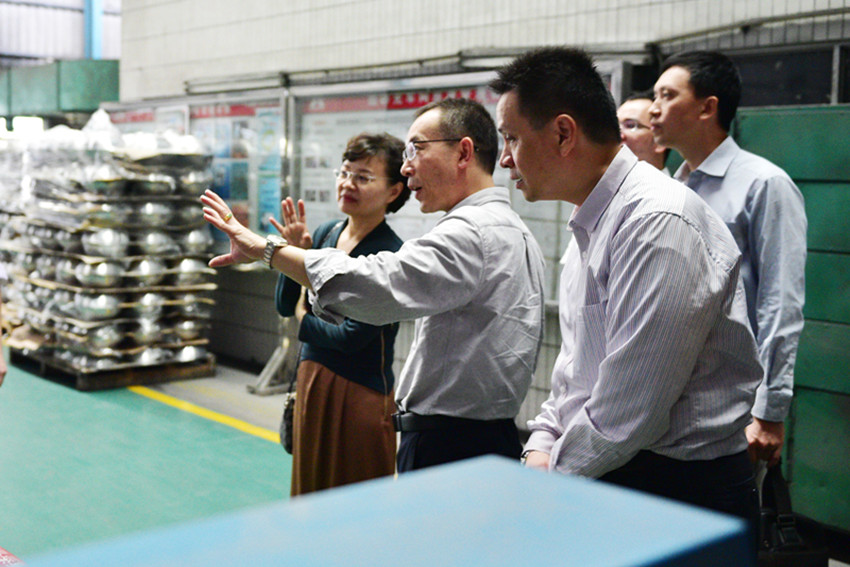 接著在劉炳耀的帶領下,調研組一行參觀了萬事泰生產車間,王月琴對集團不銹鋼制造生產環節的自動化很感興趣,對自動砂光機、自動拋光機提高的生產效率和減少用人成本的高效節能表示了高度的贊許。