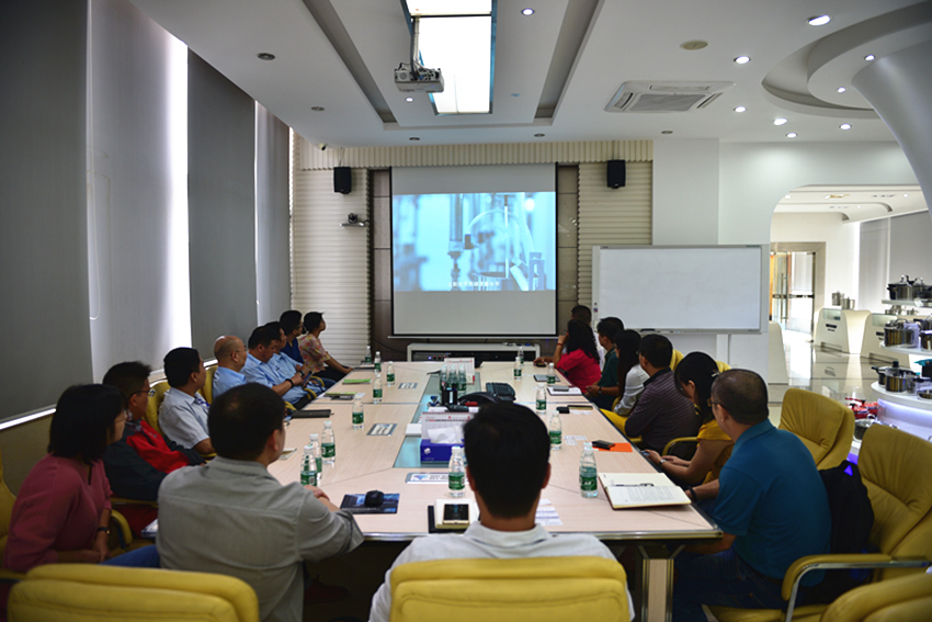 最后,在歐劍華的帶領下,調研組的領導們與集團技術中心開發人員、電器公司技術開發人員紛紛入座四樓展廳會議室,一同觀看了萬事泰集團視頻介紹。