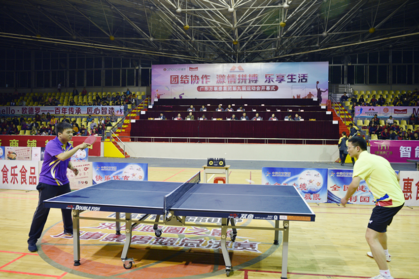 在絢爛奪目禮炮下,工作人員已經布置好了乒乓球表演賽的場地,集團乒乓球優秀選手伍時煥與張深賢在此奉獻了一場精彩絕倫的比賽。乒乓球在空中旋轉著,揮擊著理想,汗水落地成花,像象征著萬事泰力爭上游的干勁。