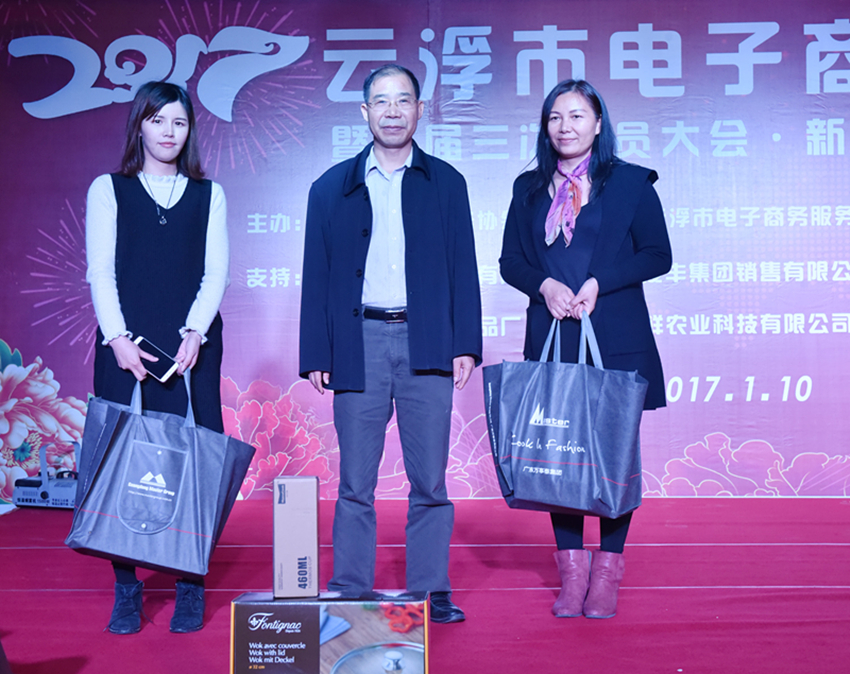 隨后,會上分別進行2016年度協會工作報告和財務報告、2016年年度“協會先進單位”和“電商風云人物”頒獎儀式、新入會會員單位授匾儀式及新富云戰略品牌簽約儀式。廣東萬事泰集團審計室主任譚琚作為企業代表上臺領獎并參與抽獎活動。