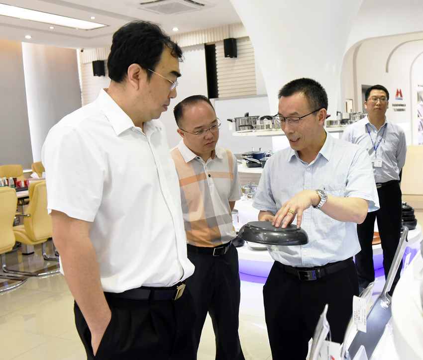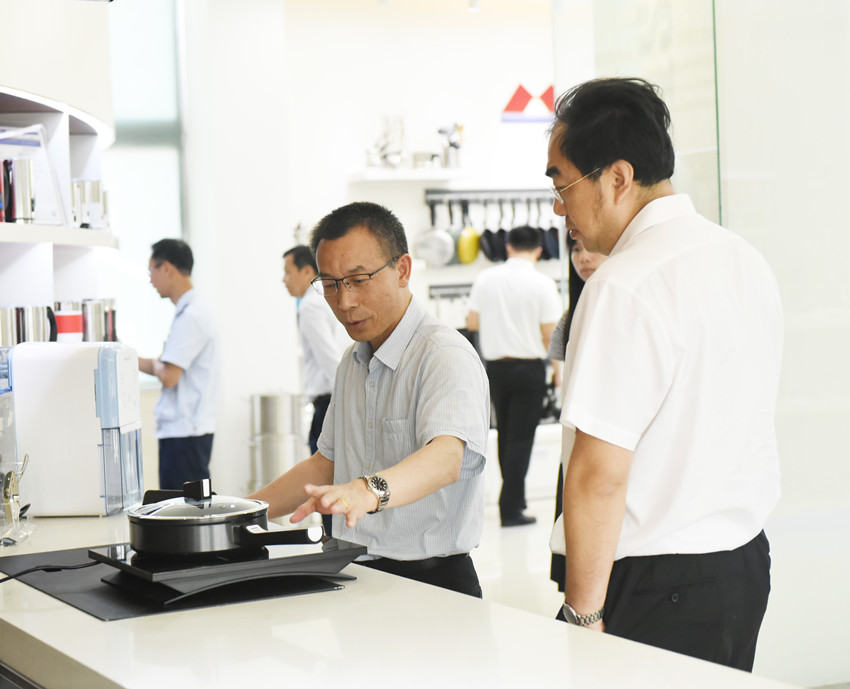 調研團一行先后來到全景廠區沙盤模型、四樓智能餐廚具產品展示廳,劉總向大家介紹了榮獲德國紅點獎的智能微壓鍋、廣交會上備受關注的智能健康大廚房等系列產品。調研團對萬事泰集團近年來在轉型升級的道路上收獲到的累累碩果表示贊嘆不已。
