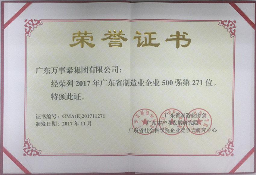 今年評選的廣東省企業500強上榜企業總體實力明顯增強,營業收入總額比上年增長14.07%,此次萬事泰入圍500強,標志著萬事泰綜合實力和行業地位得到了充分肯定和高度評價。胡志才表示道:“未來萬事泰將繼續以中國制造2025與國家供給側結構性改革政策為導向,同時以先進的互聯網+、物聯網、大數據、AI技術為依托,狠抓科技創新,大力推進產業升級和產品升級,提升企業的核心競爭力,切實提高發展的質量和效益,為廣東經濟發展做出更大貢獻?!?