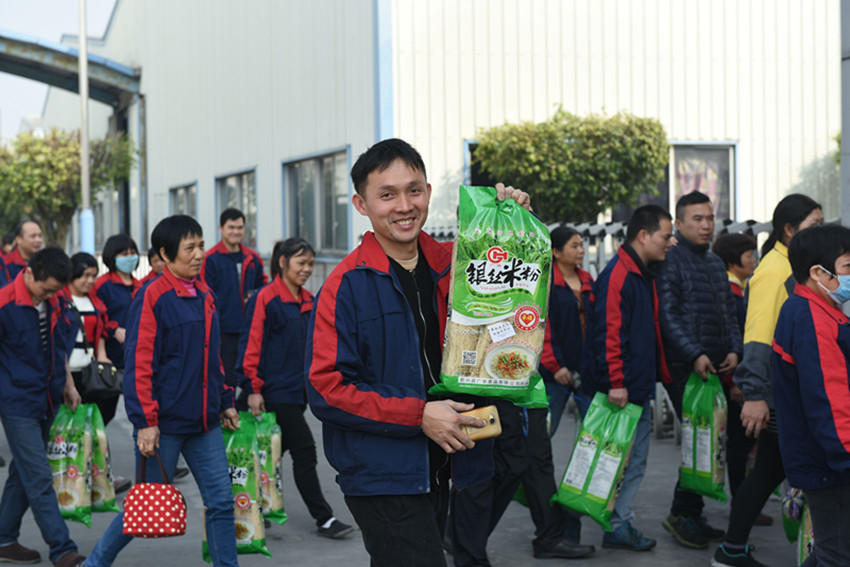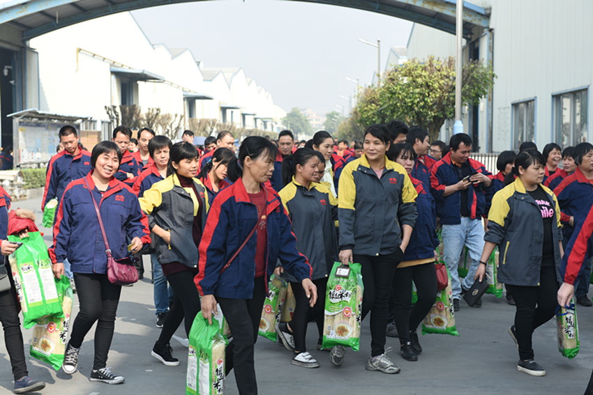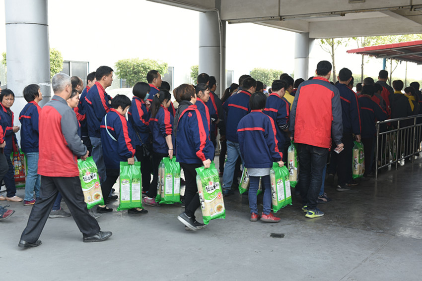 在福利發放現場,2000余名職工排起了一條井然有序的隊伍,一天忙碌的工作后,領取到福利的員工笑逐顏開,現場氛圍其樂融融。