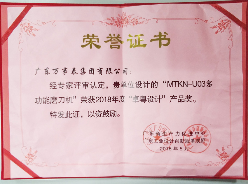 集團訊 5月31日,在廣東省生產力促進中心主辦的工業設計創新服務聯盟大會上,萬事泰旗下電器公司產品MTKN_U03多功能磨刀機憑借優秀的設計和創新的技術脫穎而出,榮獲“卓粵設計”產品獎,這是對萬事泰設計創新水平的高度肯定。