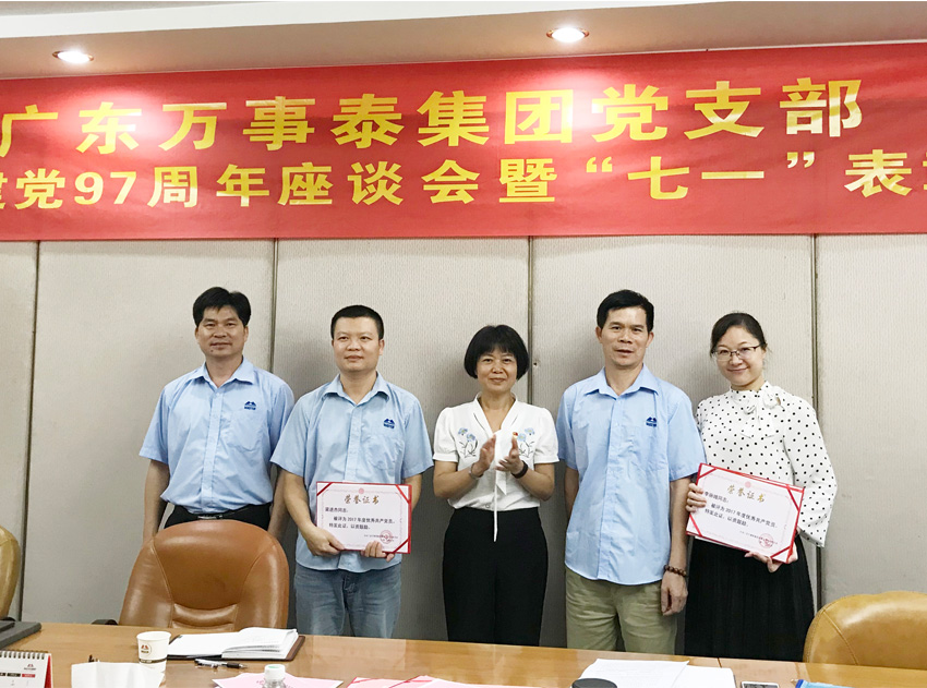 集團(tuán)訊 為慶祝中國共產(chǎn)黨成立97周年,回顧黨的光輝歷程,繼承和發(fā)揚(yáng)黨的優(yōu)良傳統(tǒng),增強(qiáng)萬事泰黨員們的凝聚力和工作積極性,充分發(fā)揮共產(chǎn)黨員的先鋒模范作用 ,6月29日下午,廣東萬事泰集團(tuán)黨支部召開紀(jì)念建黨97周年座談會(huì)暨“七一”表彰會(huì)。系統(tǒng)黨委副書記陳婉華參加會(huì)議,并為先進(jìn)基層黨組織和個(gè)人頒獎(jiǎng)。