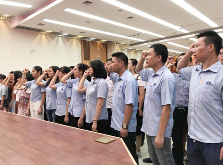 宣誓儀式上,預(yù)備黨員們精神抖擻,右手緊握拳頭,保持立正姿勢(shì),在縣委組織部副部長(zhǎng)、縣直工委書(shū)記蘇佐英的領(lǐng)誓下,面向黨旗宣誓,誓言激昂而響亮。儀式當(dāng)天,萬(wàn)事泰集團(tuán)預(yù)備黨員統(tǒng)一穿著廠服佩戴黨徽,整個(gè)宣誓隊(duì)伍生機(jī)勃勃,體現(xiàn)了萬(wàn)事泰集團(tuán)積極向上的企業(yè)精神。