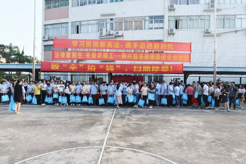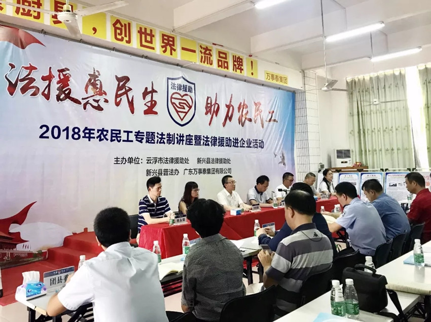集團訊 9月26日,由云浮市法律援助處、新興縣法律援助處、新興縣普法辦、廣東萬事泰集團有限公司聯合開展以“法援惠民生,助力農民工”為主題的“2018年農民工專題法制講座暨法律援助進企業活動”在萬事泰總部三樓培訓室順利舉辦,新興縣副縣長、公安局長譚成、云浮市法援處劉彤主任、縣政法委、法院、檢察院、公安局、司法局、人社局、總工會、婦聯、團委、殘聯等單位領導出席了本次活動,萬事泰常務副總裁劉炳耀、總裁辦主任梁賢武、行政部經理陳永錦參加了活動。