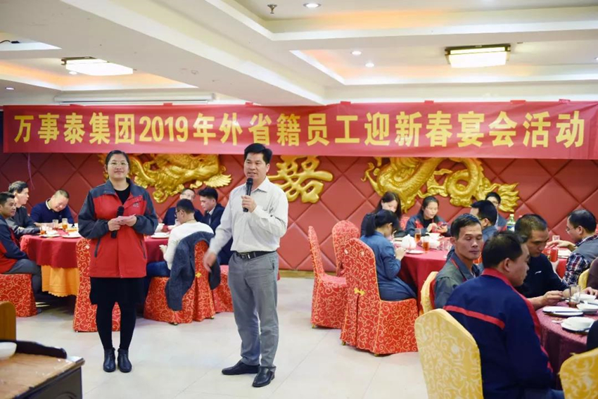 活動現場,大家圍坐在洋溢著充滿新春喜氣的餐桌旁共進團年晚餐。萬事泰工會主席梁洪光代表集團向家人們送來新年祝福并說道,“大家來自祖國各地,一年來兢兢業業工作、勤勤奮奮干事,新春佳節之際,謹代表集團對大家表示衷心地感謝。同時希望大家能在工作崗位上繼續努力,以廠為家,爭取在新興、在萬事泰安居樂業。”