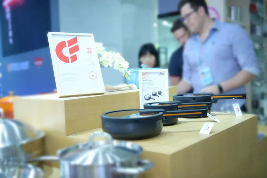 本屆展會,萬事泰集團攜數百款高端產品亮相,系列創新研發產品大放異彩,吸引眾多客商青睞。其中,最值得驕傲的是:萬事泰創新產品再次榮登廣交會CF獎舞臺,樂廚系列鍋具斬獲2019年廣交會CF獎金獎。