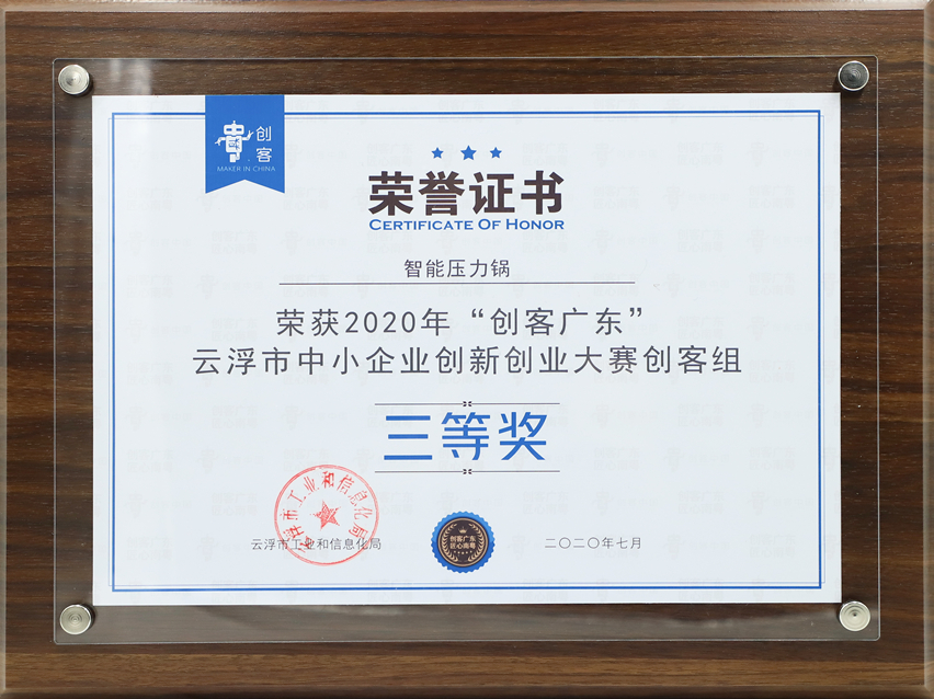 集團訊 近日,由云浮市工業和信息化局主辦,新興縣人民政府、新興縣創新中心承辦的2020年“創客廣東”云浮市中小企業創新創業大賽頒獎儀式暨創客巔峰會在云浮市新興縣隆重舉行。經過激烈的角逐,廣東萬事泰集團有限公司的“智能壓力鍋”項目榮獲創客組三等獎。
