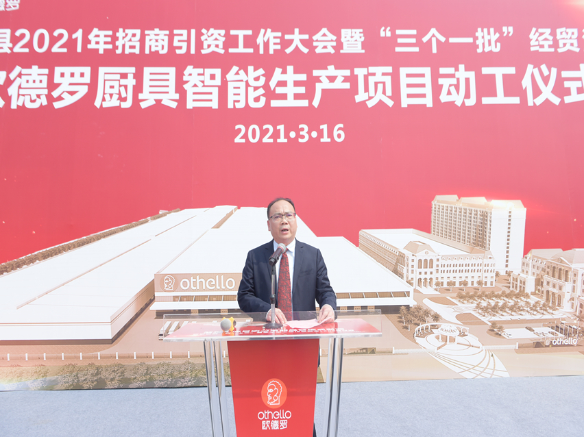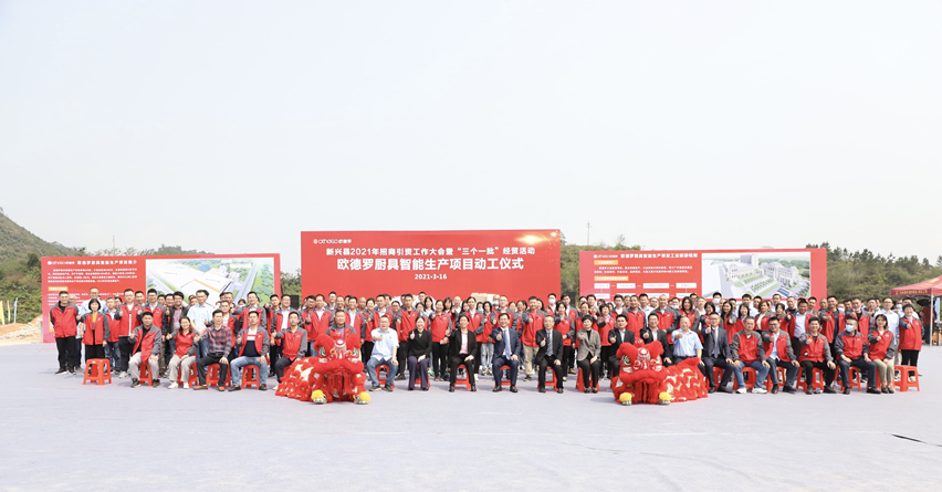 集團(tuán)訊 3月16日上午,由新興縣人民政府主辦,新成工業(yè)園、廣東歐德羅廚具股份有限公司承辦的歐德羅廚具智能生產(chǎn)項(xiàng)目動(dòng)工奠基儀式在新成工業(yè)園歐德羅智能制造產(chǎn)業(yè)園內(nèi)隆重舉行。云浮市副市長(zhǎng)施東紅,市商務(wù)局局長(zhǎng)陳金進(jìn),新興縣委書記王巍,縣委副書記、縣長(zhǎng)陳哲江等機(jī)關(guān)單位領(lǐng)導(dǎo)出席儀式共襄盛舉。廣東歐德羅廚具股份有限公司董事長(zhǎng)梁桂泉、常務(wù)副總裁劉炳耀等公司領(lǐng)導(dǎo)及歐德羅公司人員代表約150人參加了儀式。儀式由新興縣政府副縣長(zhǎng)、順德對(duì)口幫扶新興指揮部副總指揮岑樹德主持。