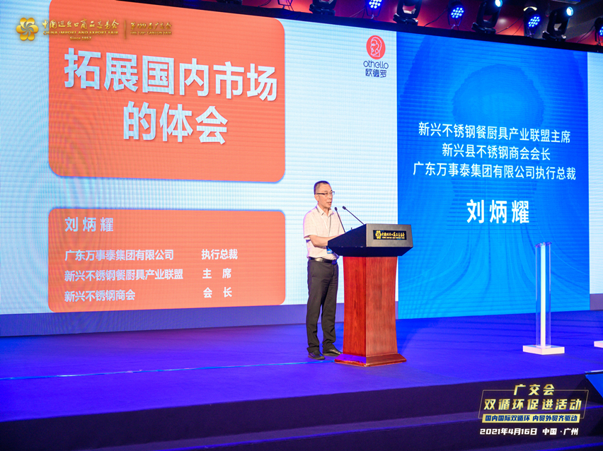 集團訊 4月16日,由中國對外貿易中心、廣東省商務廳主辦的“國內國際雙循環、內貿外貿齊驅動——第129屆廣交會雙循環促進活動”在廣交會展館成功舉辦。萬事泰集團作為廣交會品牌企業和CF獎企業,攜旗下歐德羅品牌代表產品參加了本次活動,萬事泰集團執行總裁劉炳耀受主辦方邀請出席活動,并就如何拓展國內市場作實踐經驗分享。