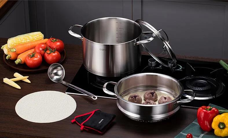 嚴選18/10不銹鋼原材,健康無涂層,耐氧化抗腐蝕,經久耐用。加大水位刻度清晰,方便掌握水量。拉絲拋光工藝,耐污易潔。蒸煮同時進行,一鍋多用不串味滿足一家使用。受熱更均勻,多爐灶通用 。