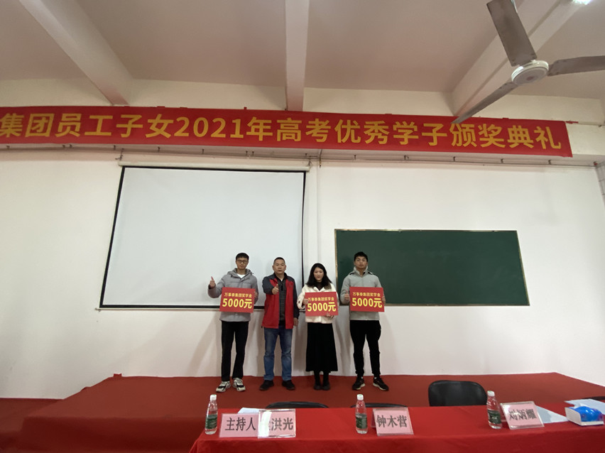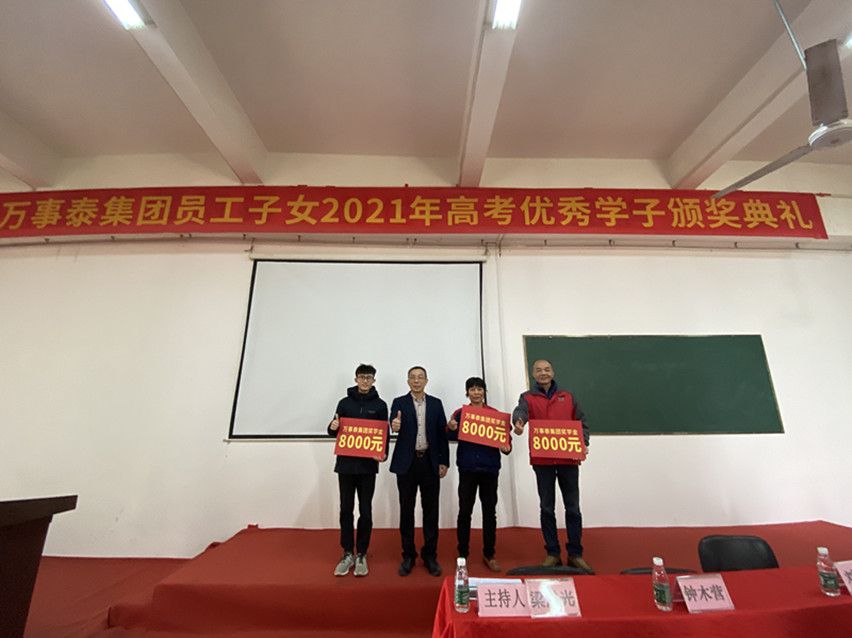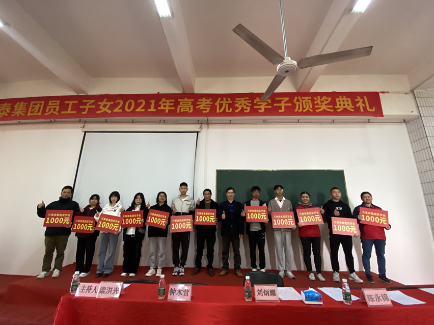 頒獎(jiǎng)典禮由黨支部書記、工會(huì)主席梁洪光主持,人力資源部主管區(qū)冠文宣讀《萬(wàn)事泰集團(tuán)關(guān)于員工子女獎(jiǎng)學(xué)辦法》及獎(jiǎng)學(xué)決定,陳永錦總監(jiān)、梁洪光書記為23名普通本科高校學(xué)子頒發(fā)每人1000元獎(jiǎng)學(xué)金,鐘木營(yíng)總經(jīng)理為211高校學(xué)子頒發(fā)每人5000元獎(jiǎng)學(xué)金,劉炳耀執(zhí)行總裁為985高校學(xué)子頒發(fā)每人8000元獎(jiǎng)學(xué)金。